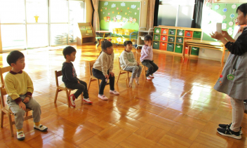 歌に合わせて横のお友達に玉を渡すゲームでは、一人の子が2個も3個も持ってしまうこともありましたが、リズムに合わせて遊ぶおもしろさを少しずつ感じながら、楽しんでいましたsad