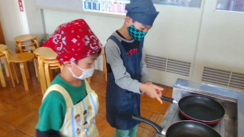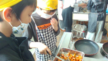 1学期には「ウスターソースの魅力は、料理の味付けのメインではないけれど、少し加えることで料理の味に深みを出し、本来の料理をよりおいしくすること」ということを学びました。このことを実感するため、事前にレシピを調べました。たくさん集まったレシピの中から、今回は、もやしとツナの和え物、焼きおにぎり、ウインナーソテーを作りました。どの料理も、ウスターソースあり・ウスターソースなし の2パターンを作り、味を比べながら試食しました。結果、「どちらもおいしいけど、ソースがあるとちょっといい感じがする!」という感想が聞かれました。
