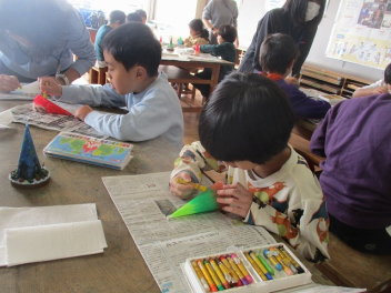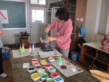 クレヨンを使って、ろうそくに思い思いの色を塗っていきます