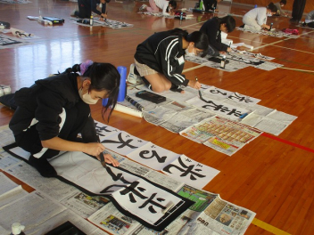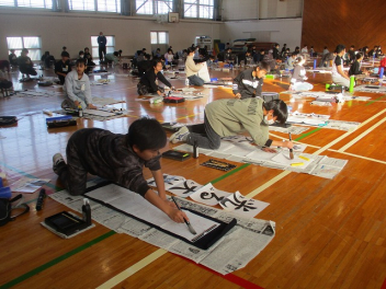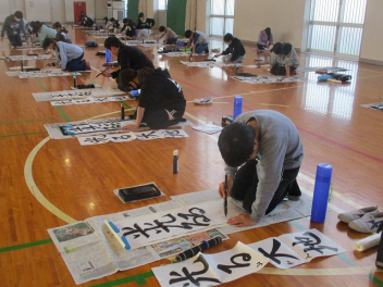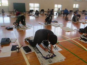 体育館がしいんと静まり返り、心を整え、真剣に書き初めに取り組む子供たちの姿が印象的でした