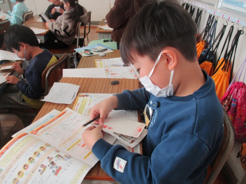 先生から年賀状の書き方セットの使い方を教わり、いよいよチャレンジですsad