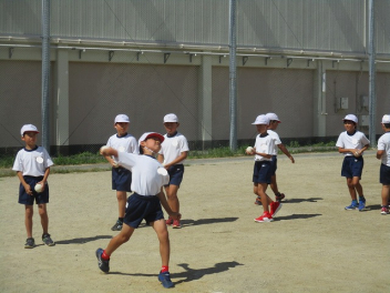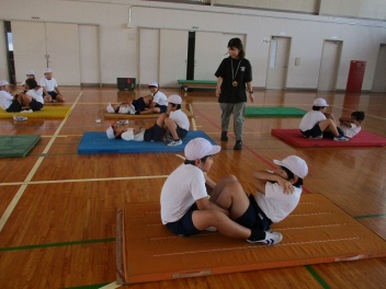 体育館では上体起こしや反復横跳びを、運動場では50m走やソフトボール投げを行いました