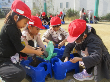 自分で入れたり、くすのき応援団ボランティアの皆さんに手伝ってもらったりしながら、鉢に苗を入れる作業を終えることができました