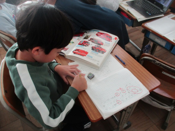 いろいろな自動車のはたらきや作りを調べた1年生は、まとめとして自動車図鑑作りにチャレンジしています