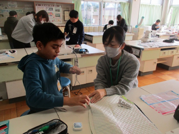 5年生はエプロン作り、6年生はトートバッグ作りをしています