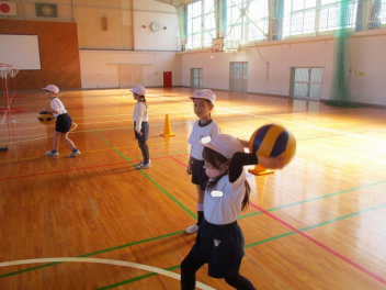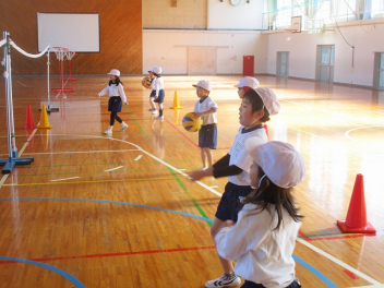 • 1年生の体育では、ボール投げゲームをしていますsad