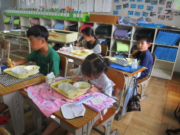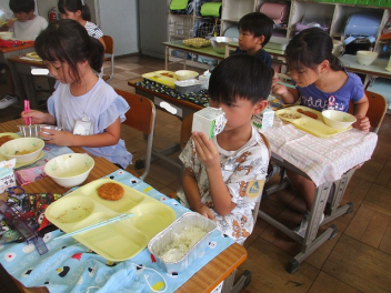 給食を楽しみにしていた子供たちは、おいしそうにもりもり食べていました