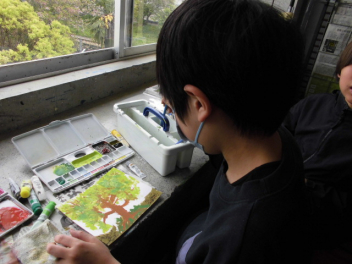 さっそく、次の時間には「絵の具スケッチ」に取り組みました。窓から見える春の景色から描き表したいと感じたものを選び、ある子は新緑を、ある子は葉桜を、ある子は穏やかに流れる芳川をと、思い思いに選んで描き表しました。
