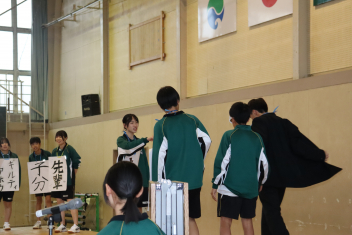 生徒会執行部および専門委員長が協力して劇団を作り、自分たちで考えた劇を通して、北部中学校での生活の様子やルールなどを新1年生に楽しく伝えていました。