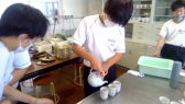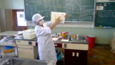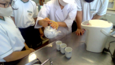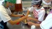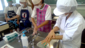給食の調理員の方たちと同じ手洗い、消毒の方法で行いました。衛生に気を付けて手洗い消毒を行っていることを実感しながら、正しい手洗い、消毒の仕方を学ぶことができました。