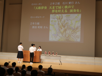 ・スローガン「天歌夢奏(てんかむそう) 天まで届く歌声で 夢を叶える 演奏を」石川 愛巳さん(2-2)