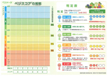 写真のように測定結果が点数やランクで示され、不足している野菜量や目安が一目で分かる