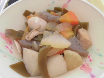 鶏肉・にんじん・だいこん・こんにゃく・こんぶ・さといも・うずら卵を使って作りました。