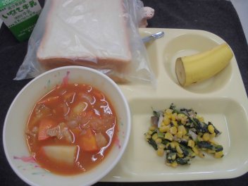 今日は、鶏肉のほかにさつまいもやさつま揚げ・ごぼう・にんじん・こまつななど具沢山のみそ汁でした。