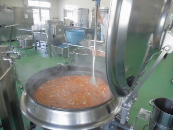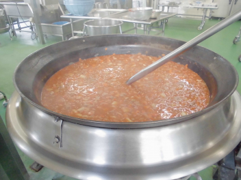 給食のポークシチューは、小麦粉とバターを炒めてブラウンルウを作るところから始まります。