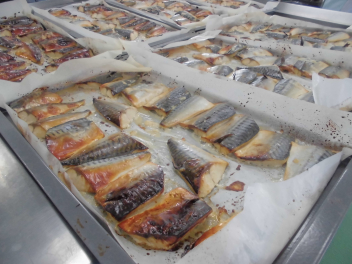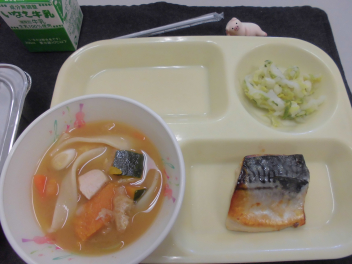 さわらのねぎソースかけの葉ねぎ、おひたしの小松菜、ごまみそ汁の大根、白菜が旬の地場産物です。