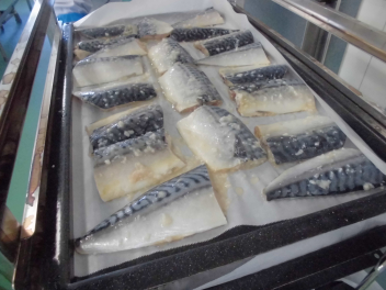ブロッコリーは、スチームコンベクションオーブンで蒸してから塩をふりました。