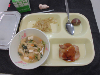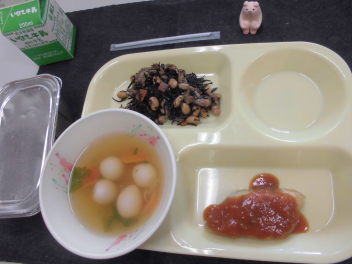 今日の給食では、「さわらのみそあんかけ」のさわらや「ひじきの炒め煮」の大豆と油揚げ、「うずら卵のすまし汁」のうずら卵にたんぱく質が多く含まれています。
