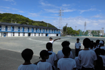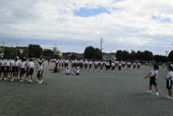 1日目はみんなで長縄練習です。体育大会実行委員長の指示を聞いて、グランドに広がって練習開始です