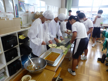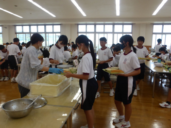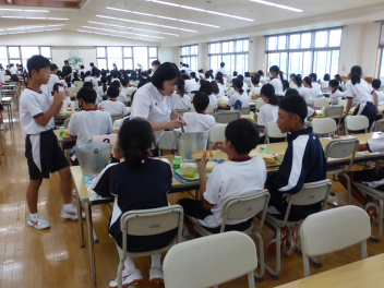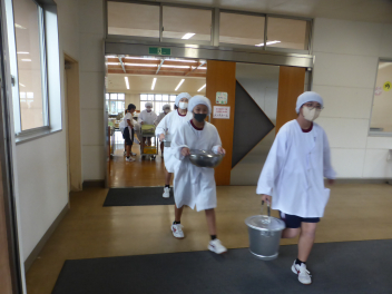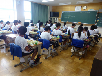 真夏はランチルームが暑いため、冷房の効いた教室で給食を食べています。