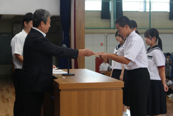 「後期学級役員任命式」では、後期の学級委員、書記が呼名されると、元気な、そして気持ちの入った返事が体育館に響き渡りました。さすが学級役員、という感じでした。その中でも3年生は一段と素晴らしい返事でした。短い「はいっ」の返事に、「やる気」「決意」「学級の誇り」まで感じました。