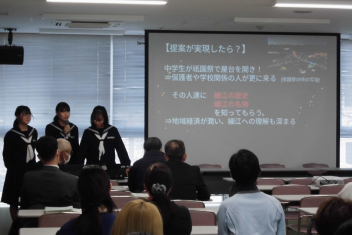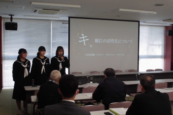 13日(土)、みをつくし文化センターにて、「細江まちづくり協議会」が開かれました。今年も本校の生徒が招かれ、ホソ・トレ(細江中学校の「総合的な学習の時間」におけるで追究活動)で追究してきたことを発表しました。