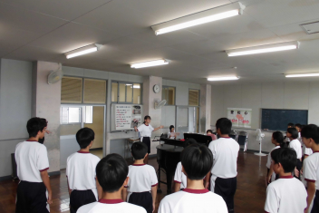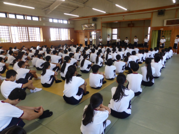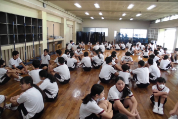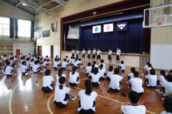緑団(3-3、2-5、1-2)は、3年生がこれまで準備して考えた内容を1、2年生に伝えることを中心に集会を行いました。グループに分かれて1、2年生に伝えましたが、ちゃんと伝わっていたのか分かりません。ちゃんと1、2年生とも内容や思いを共有し、気持ちを一つにして頑張りたいです。