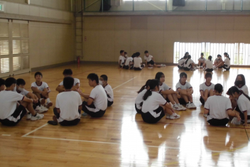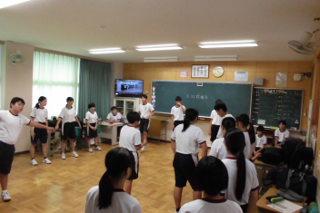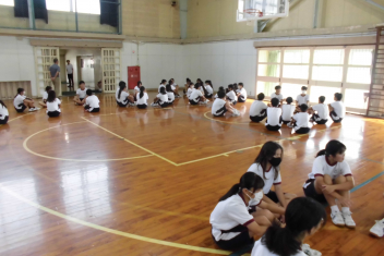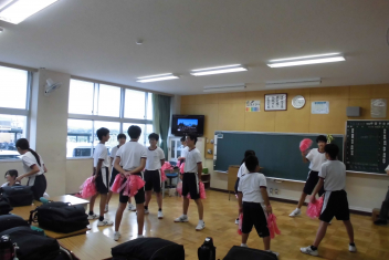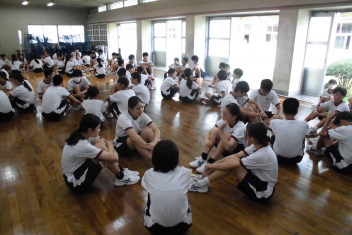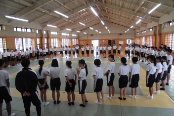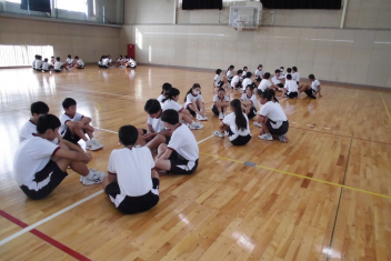 ピンク団(3-5、2-4、1-1)は、1年生から3年生までの全員の絆を深めることを目的に行いました。また、特に1年生が体育大会のイメージを持てるように説明をしました。事前に伝えたいことを考えておき、縦割りの小グループになって伝えました。仲良くいい雰囲気でやれたとは思いますが、時間が足りなかったので、これからの練習の時に、3年生からしっかりと伝えていきたいです。