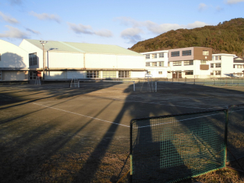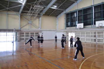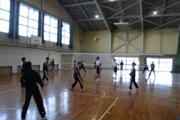 体育館では体育の授業で、1年生がバトミントン、2年生がバレーボールをやっていました。