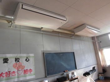 普通教室にはすでに導入されているエアコンが、音楽室や理科室、木工室など、特別教室にも設置されます。電気電圧系統の点検や試運転を経て、来年度の初夏あたりには稼働する予定です。授業にいっそう集中できる環境が整いますので、ぜひ主体的かつ意欲的に学習に取り組んでほしいと思います。