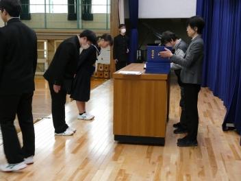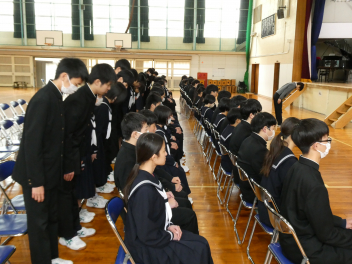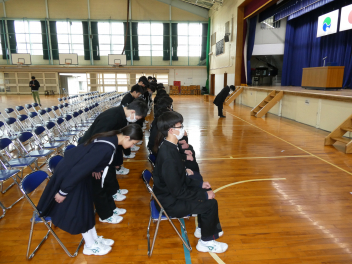 3年生の所作が卒業式の凛とした雰囲気をつくりだすわけですが、その一つに「礼」があります。タイミングや角度がピッタリと合う礼は、一体感が生み出す美しさを感じるほどです。3年生ならきっと立派な礼を見せてくれるでしょうfrown