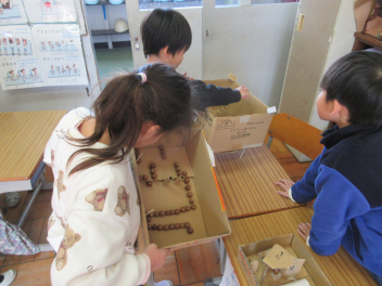 • 生活科の授業で、秋の物(どんぐりやまつぼっくりなど)を使って、アクセサリーやけん玉、迷路などを作りました。
