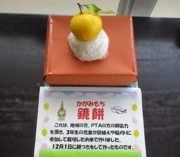 職員玄関のところに、3年生が餅つきでついたお餅を鏡餅にして飾ってあります。