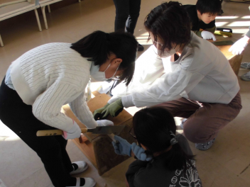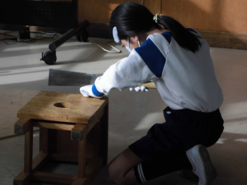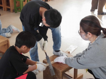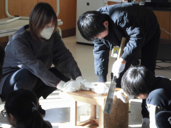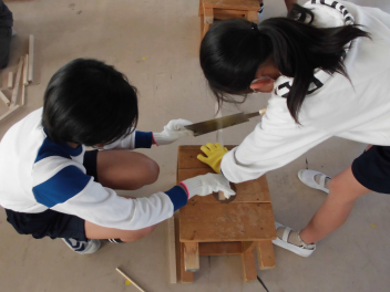 • 4年生の図画工作科「のこぎりギコギコ」の学習で、のこぎりを使って木材を切る活動を行いました。