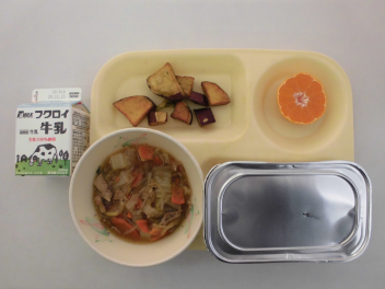 今日の給食は、ふるさと給食で、五目あんかけご飯・牛乳・さつまいもの抹茶塩かけ・みかんでした。