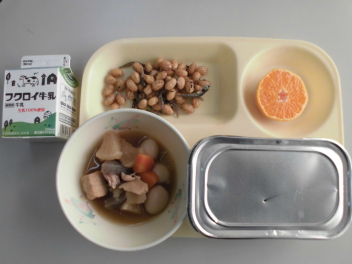 今日の給食は、ご飯・牛乳・かんとうに・大豆と煮干しの甘辛和え・みかんでした。