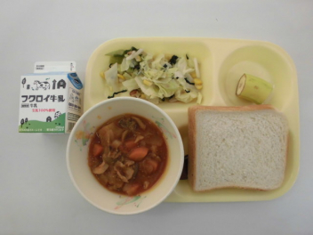 今日の給食は、パン・牛乳・ポークトマトシチュー・野菜ソテー・バナナでした。
