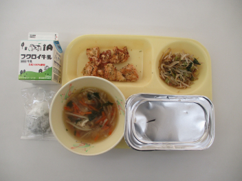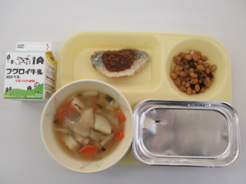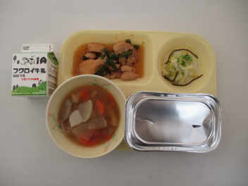 今日の給食は、ご飯・牛乳・鶏肉の照り煮・のっぺい汁・白菜づけでした。