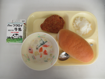 今日の給食は、野菜を食べよう献立(パン・牛乳・かぼちゃのひき肉コロッケ・大根のレモンマリネ・冬野菜のミルクスープ)でした。