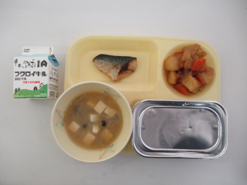 今日の給食は、ご飯・牛乳・鯖の塩焼き・じゃがいもの煮つけ・味噌汁でした。