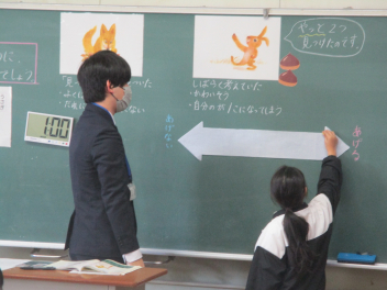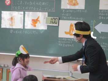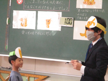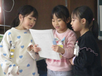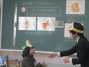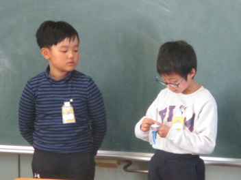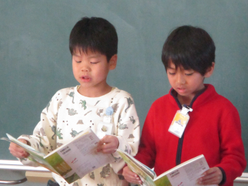 • 1年生の教室に行ってみると、参観会の時の発表会の練習をしていました。