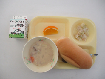 今日の給食は、「浜松パワーフード給食」でパン・牛乳・クリームシチュー・セロリのサラダ・ネーブルでした。