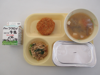 今日の給食は、ご飯・牛乳・海老芋コロッケ・アーモンドあえ・豚汁でした。