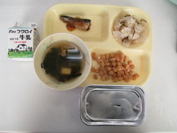 今日の給食は、節分の行事食でした。ご飯・牛乳・鰯の梅煮・大根の浅漬け・すまし汁・福豆でした。