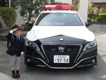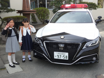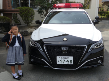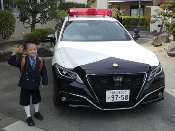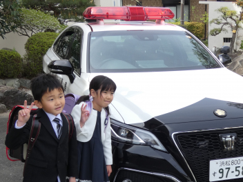 今日は、交通安全のためにパトカーも来校して、1年生と記念写真を撮ることができました。