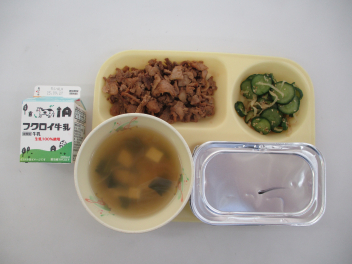 今日の給食は、ふるさと給食の献立でした。豚肉のはまなっとうソース炒めが出ました。