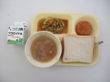 今日の給食は、パン・牛乳・さつま芋コロッケ・カレーソテー・玄米入りスープでした。
