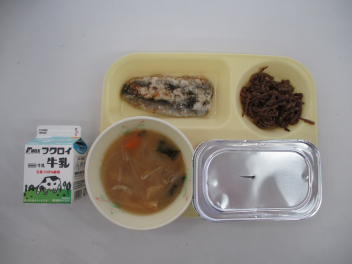 今日の給食は、ご飯・牛乳・イワシの蒲焼・こんにゃくのきんぴら・味噌汁でした。