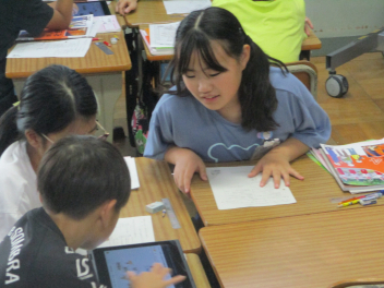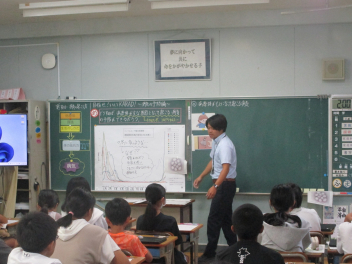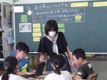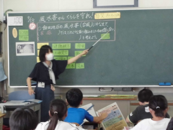 • 4年生の社会、「風水害からくらしを守れ!」の授業風景です。