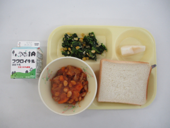 今日の給食は、パン・牛乳・ポークビーンズ・ほうれん草ソテー・梨でした。